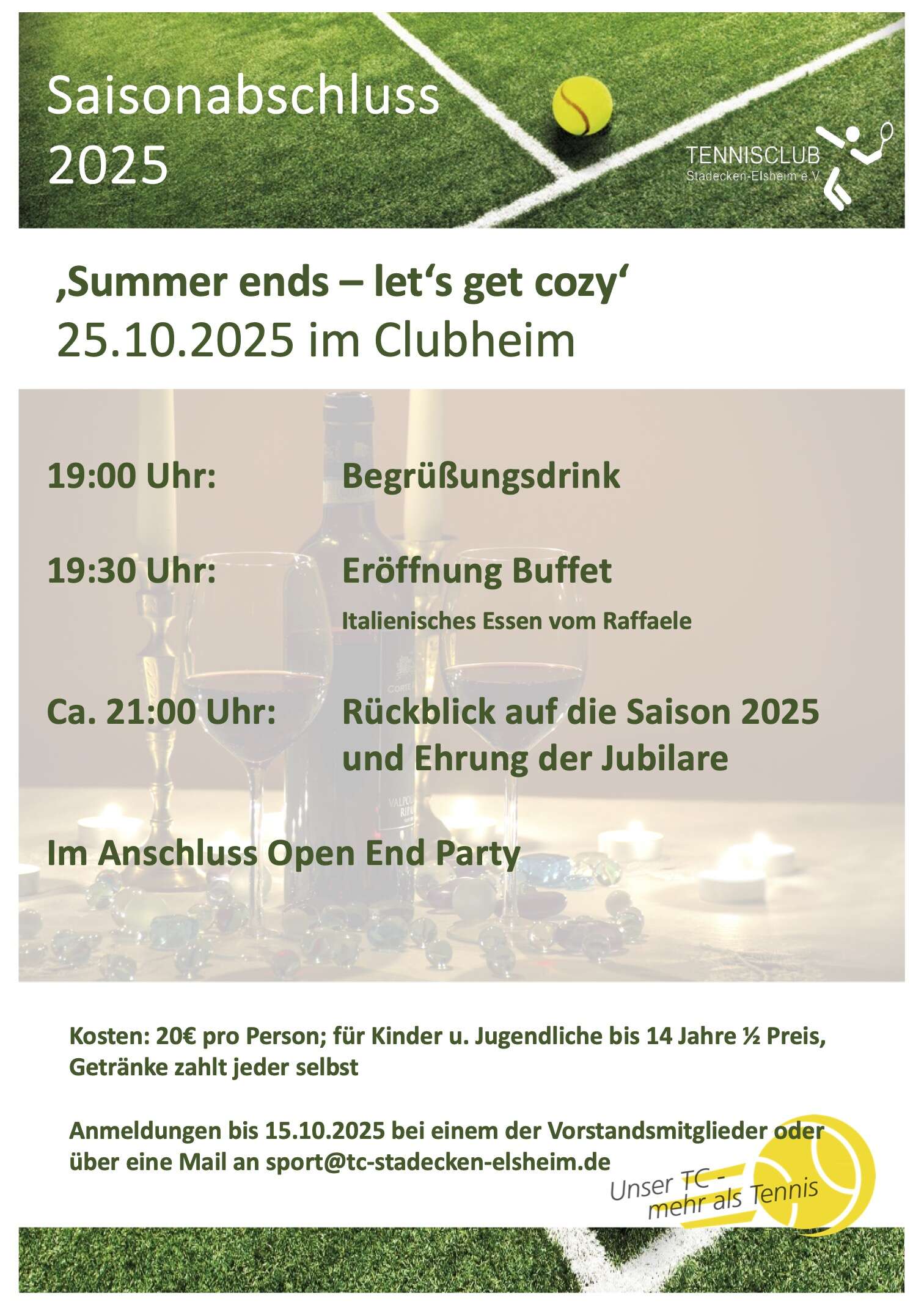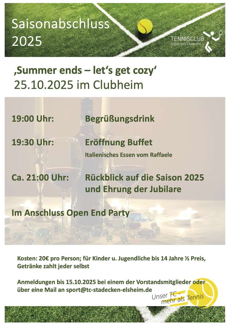 Die Tennis-Sommersaison neigt sich dem Ende zu und wir möchten mit euch an einem gemütlichen Abend mit Köstlichkeiten vom Raffaele und leckerem Rotwein in unserem Clubheim die gemütliche Jahreszeit einläuten.